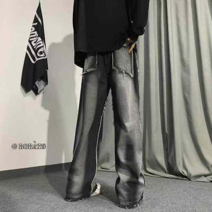 春季新款男士网红复古爆款洗水棉潮牌毛边拼接工装直筒阔腿牛仔裤,独立包装...