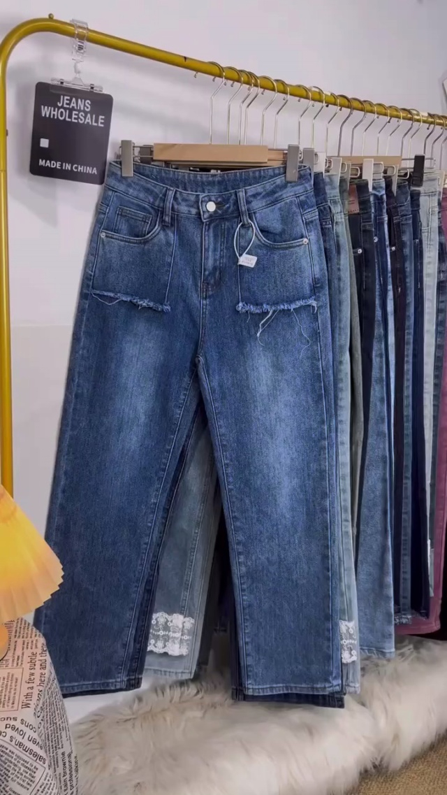 天猫下架一批高品质网红靓妹女装洗水棉小整杂款牛仔阔腿直筒烟管紧身牛仔裤...