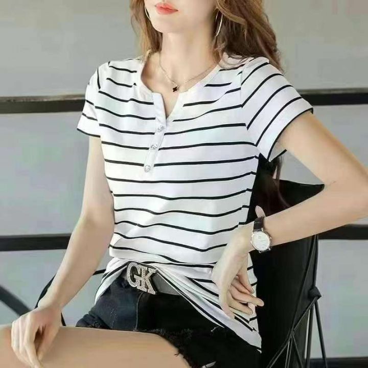 淘宝下架一批纯棉95拉架条纹t恤女士短袖2024夏季新款宽松显瘦上衣,数量550...
