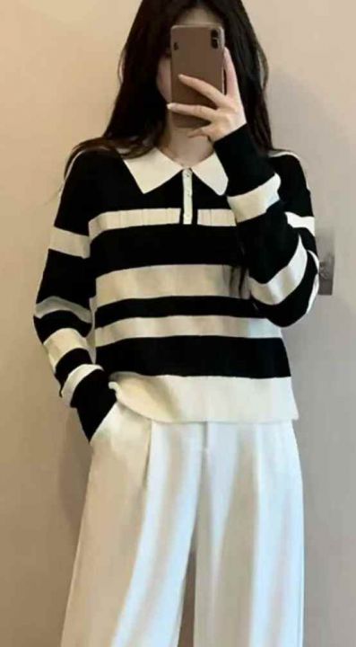 秋冬新款撞色条纹宽松Polo领套头毛衣,独立包装,均码面料柔软舒适弹力大,...