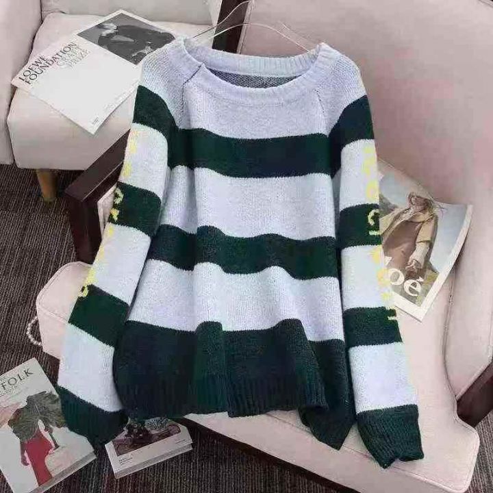 女装秋冬款复古撞色条纹ins港风大版厚重宽松毛衣针织衫上衣,独立包装,均...