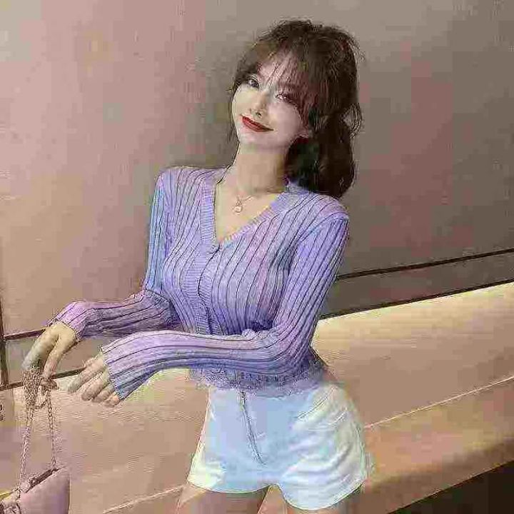 韩版2025chic长袖针织开衫女装外套毛衣春秋新款修身蕾丝边开衫,独立包装,...