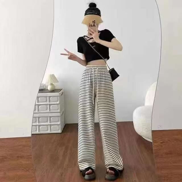 ☕️1200条全清9.5元,夏季休闲裤新款慵懒风宽松直筒高腰阔腿条纹裤子女拖...