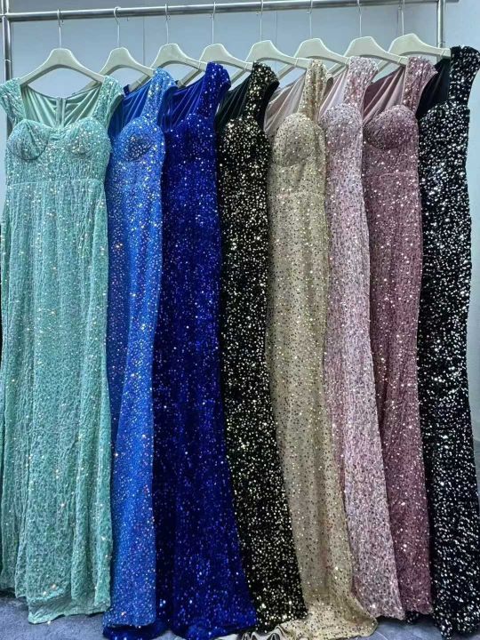 清450条,欧美中东外贸跨境INS纯色V领亮片吊带高腰晚礼服鱼尾裙长裙连衣裙...