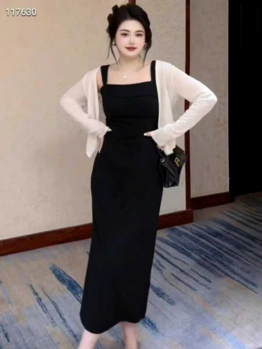 86套,套装大码女装法式黑色吊带连衣裙夏季2025新款胖mm梨形身材收腰长裙子...