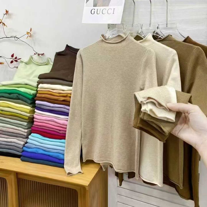 秋冬新款高品质网红弹力修身显瘦卷边半高领温柔风包芯纱打底外穿套头毛衣,...