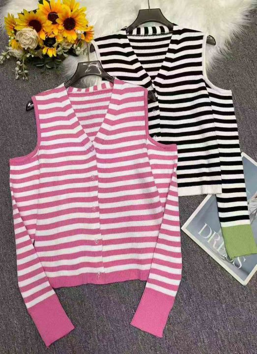 秋季新品纯欲风V领露肩小心机设计感条纹显瘦针织开衫,独立包装,均码面料...