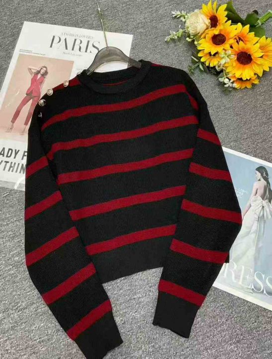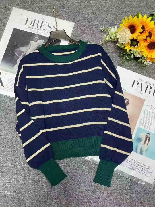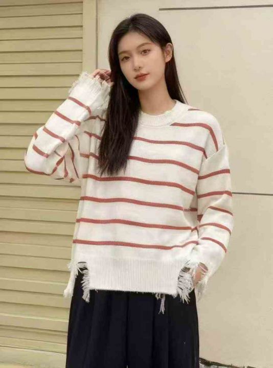 秋季新款短款宽松港味复古慵懒风撞色条纹针织套头毛衣,独立包装,均码面料...