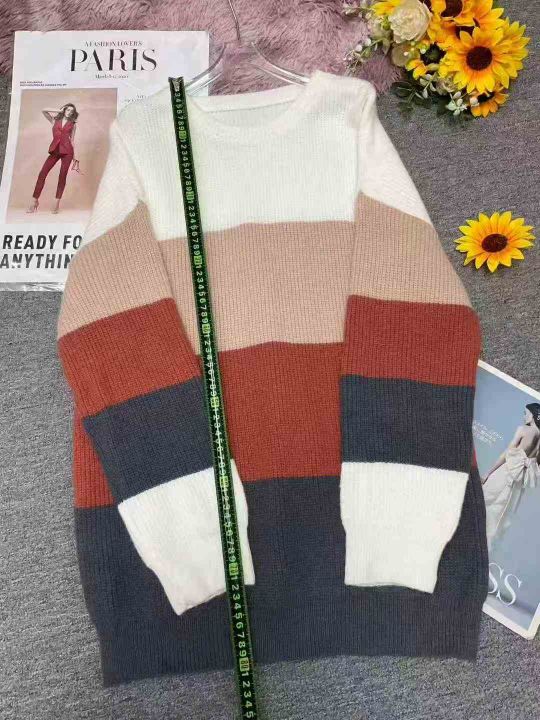 秋冬季新品韩版宽松百搭撞色条纹设计款加厚包芯纱套头毛衣,独立包装,均码...