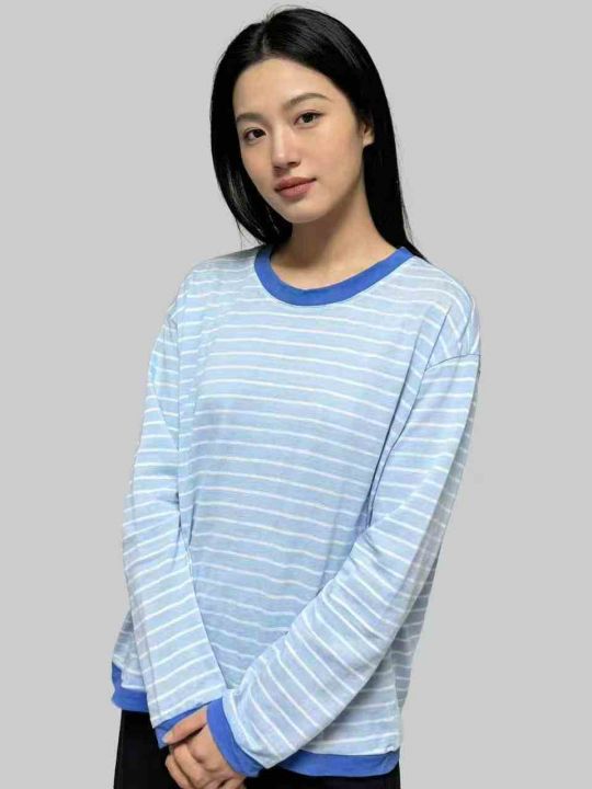 夏季透气撞色条纹长袖T恤女宽松薄款纯棉上衣,图片款,品质好可入实体店,...