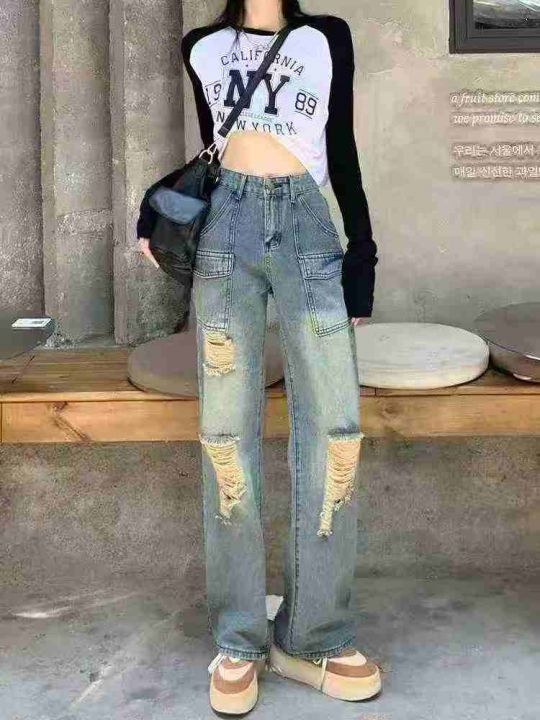 ☕️美式复古做旧破洞阔腿工装牛仔裤男女春秋潮牌设计感宽松直筒裤子 520条...