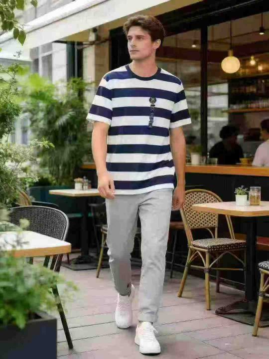 圆领条纹纯棉短袖T恤,清9.8码数M一3XL,数量610件左右,纯棉面料,商场下...