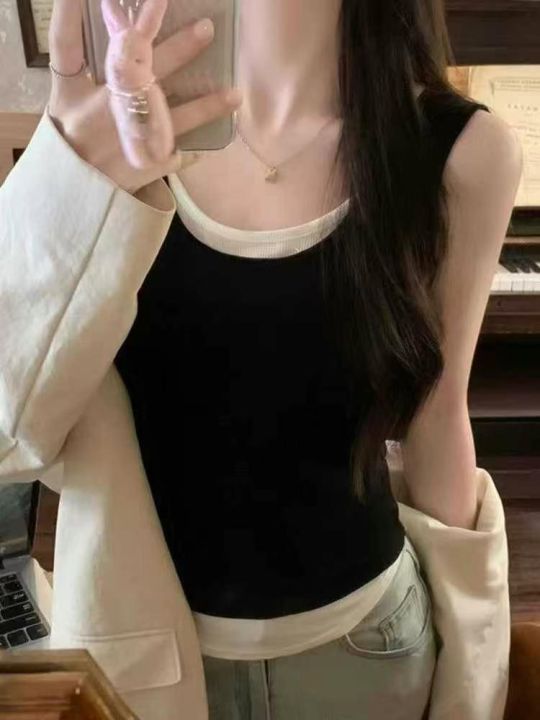 带胸垫港风假两件背心设计感小众辣妹打底内搭吊带外穿潮流无袖上衣 独立包...