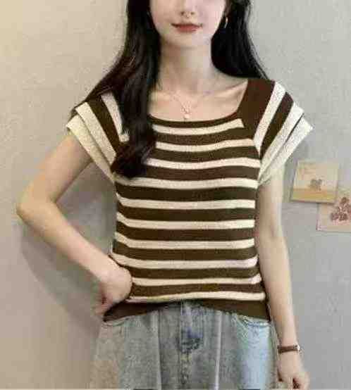 夏季新款气质层次感飞飞袖甜美减龄撞色条纹针织T桖,独立包装,均码面料柔...