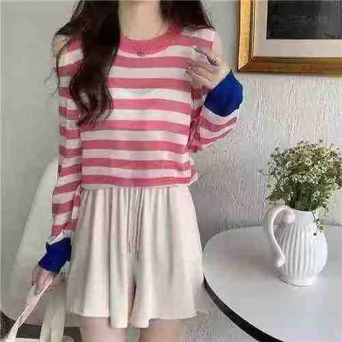4.9元特价清小心机露肩减龄甜美宽松条纹针织衫,数量500件左右,单款多色,...