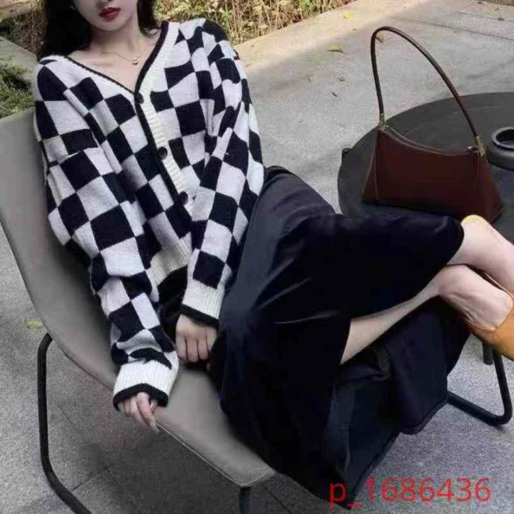 棋格子毛衣外套女春秋季2025新款复古日系慵懒风大版宽松V领针织开衫,独立...