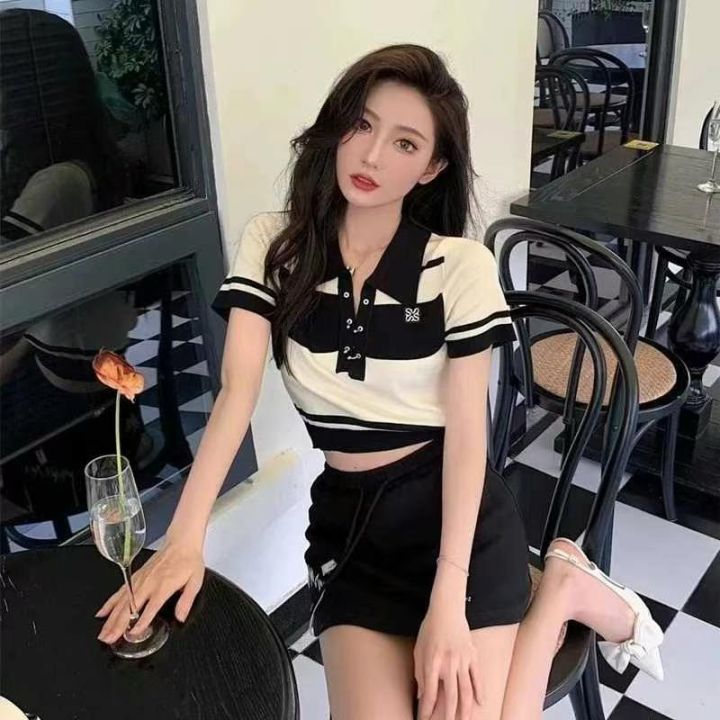夏季新款女装盐系刺绣条纹撞色设计感小众宽松短款针织Polo衫,独立包装,均...