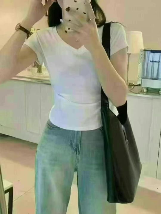 靓妹纯欲风女百搭修身版V领辣妹短袖T恤,面料柔软亲肤有弹力,770件,1-4码...