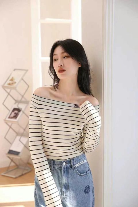 春季女装女装字母条纹设计感一字领长袖套头毛衣,独立包装,均码面料柔软舒...
