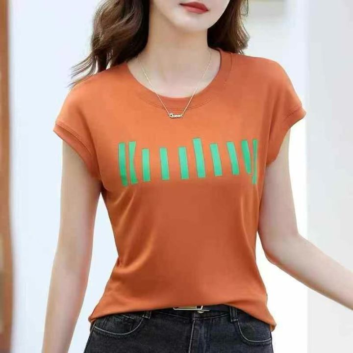 舒适莫代尔字母印花t恤女短袖夏季新款时尚体恤显瘦宽松上衣,面料:莫代尔...