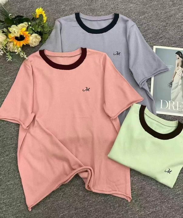 夏季新款宽松百搭设计感小众撞色圆领刺绣字母冰丝针织短袖T恤,独立包装,...