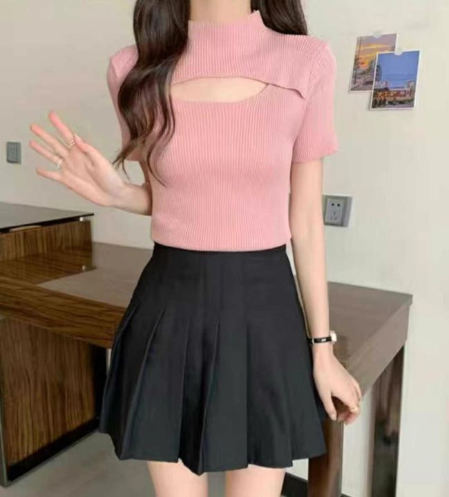 夏季新款韩版温柔风设计感时尚别致镂空弹力修身显瘦气质短袖针织小衫,独立...