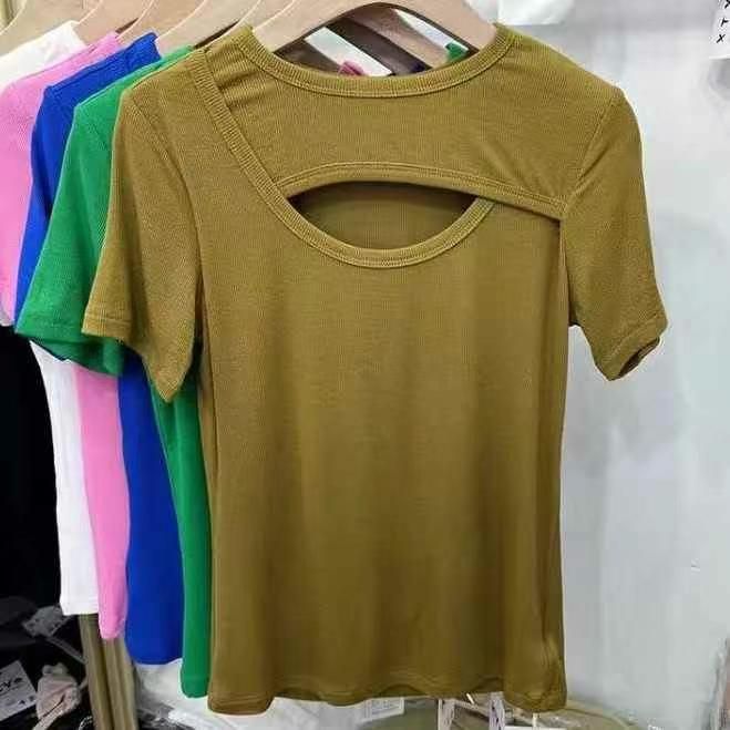 螺纹镂空设计感圆领短袖t恤女夏季修身显瘦百搭打底衫上衣,整款2色,1,2码...
