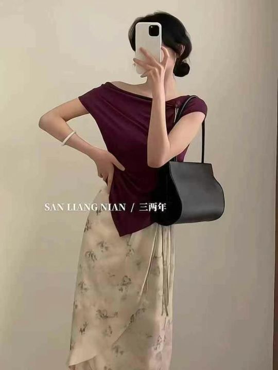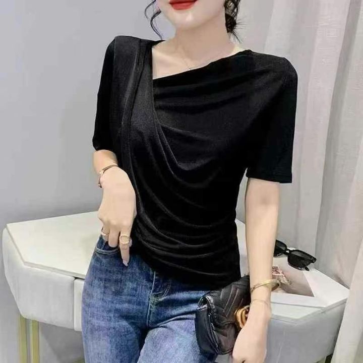 全清6.5性感辣妹一字肩短袖t恤女2025夏季设计感不规则修身显瘦褶皱上衣,31...