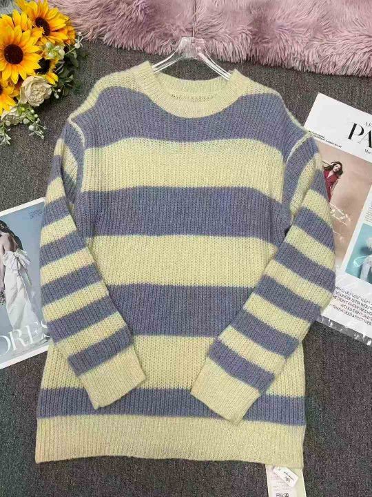秋冬新款宽松大板撞色条纹加厚圆领套头毛衣,独立包装,均码面料软糯舒适,...