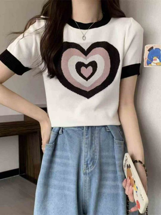 捡漏款,夏季新款正肩甜酷撞色设计感爱心提花弹力修身显瘦针织短袖,独立包...