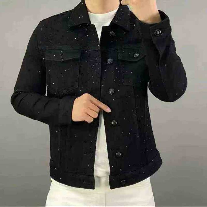 秋季爆款网红痞帅牛仔夹克男高级感翻领潮牌满天星烫钻重工黑色外套130件,...