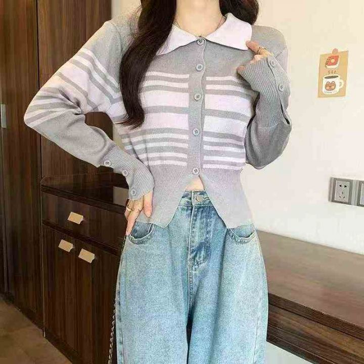 秋装新款设计感撞色洋气韩版polo领别致针织毛衣开衫,独立包装,均码面料柔...