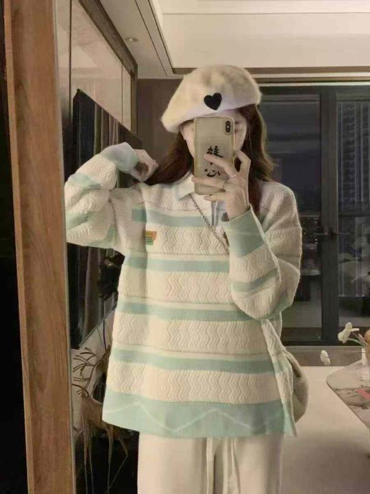秋季软糯温柔学院风条纹毛衣女宽松娃娃领百搭长袖针织衫,面料柔软,独立包...