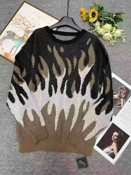 秋冬新款国潮牌原创撞色渐变火焰暗黑亚比风男女同款提花芝麻底圆领套头毛衣...