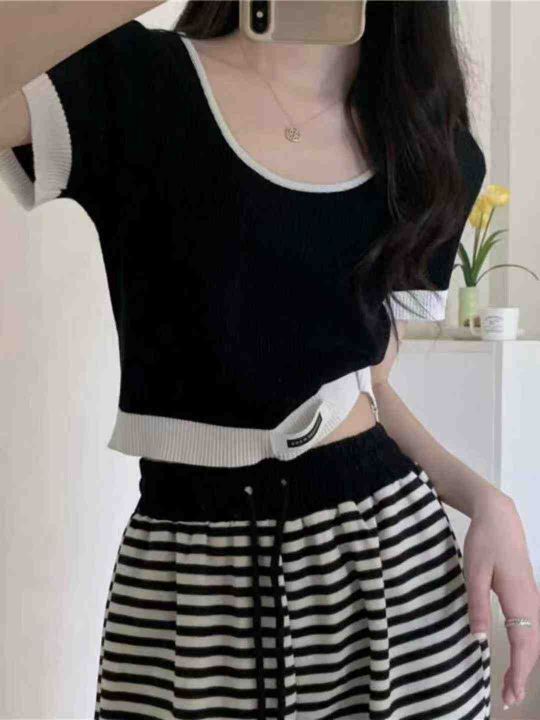 夏季新款法式甜辣风撞色港味复古针织短袖T桖,独立包装,均码面料柔软舒适...
