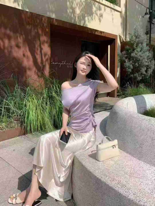 上新全清:10.8一件紫色醋酸缎面不规则一字斜肩上衣,[爱心]100件左右,码...