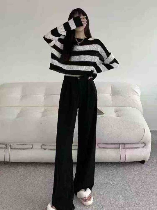 早秋新款靓妹短款宽松撞色黑白条纹针织长袖小衫,带配饰有垫肩(个别没有配...