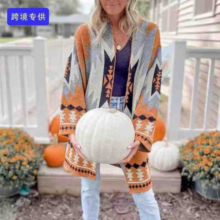 欧美宽松大版型秋冬新款女装中长款复古印花呢子毛衣开衫外套,2个款,独立...