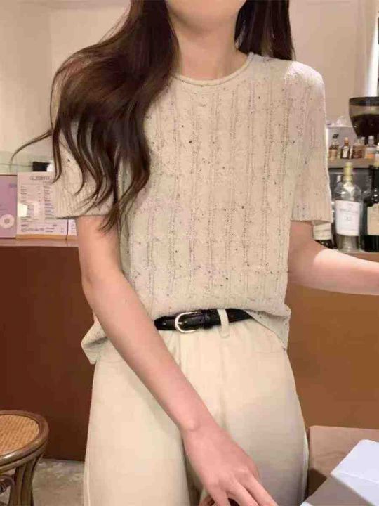 夏季新款韩版复古麻花冰丝圆领短袖针织T恤,独立包装,均码面料柔软舒适透...