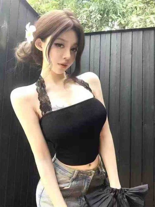夏季新款性感纯欲辣妹蕾丝拼接挂脖抹胸背心针织,独立包装,均码面料柔软舒...