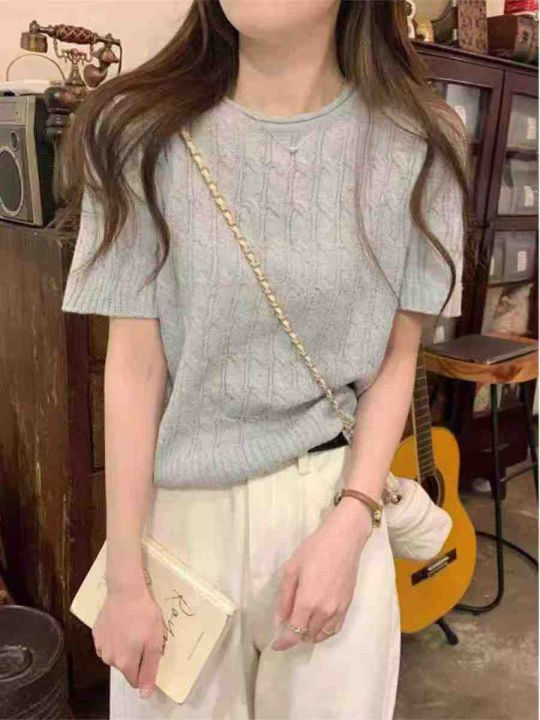 夏季新款韩版复古麻花冰丝圆领短袖针织T恤,独立包装,均码面料柔软舒适透...