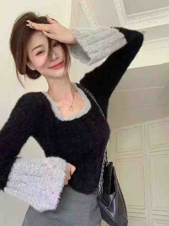 秋冬新款仿水貂毛撞色喇叭袖套头毛衣,独立包装,均码面料软糯厚实,宽松款...