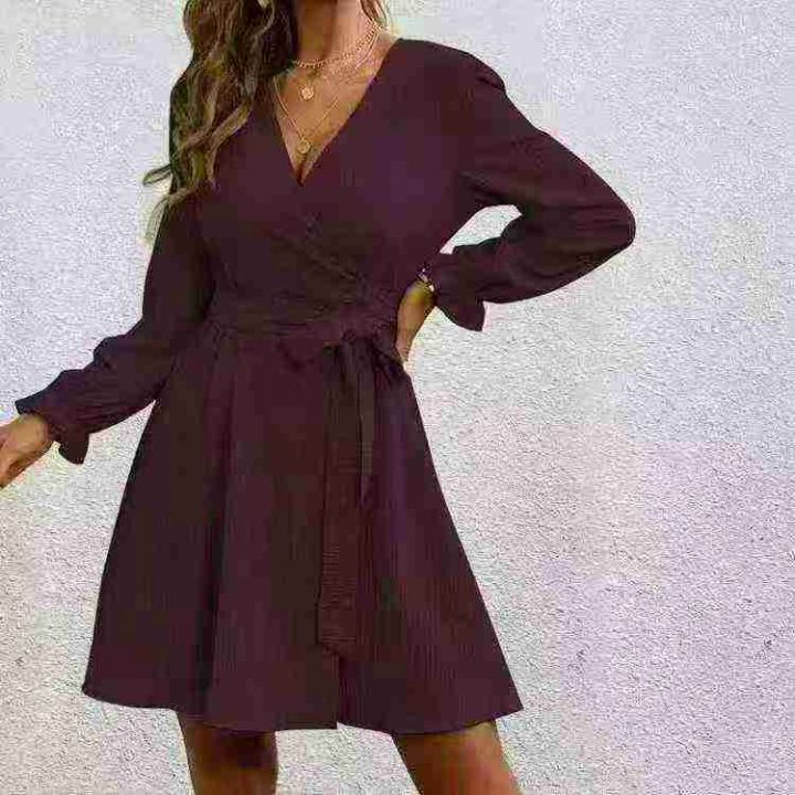 清货价9.8,数量147件左右纯色裹胸款春秋季衩领束带灯笼袖长袖连衣裙尺码S-...