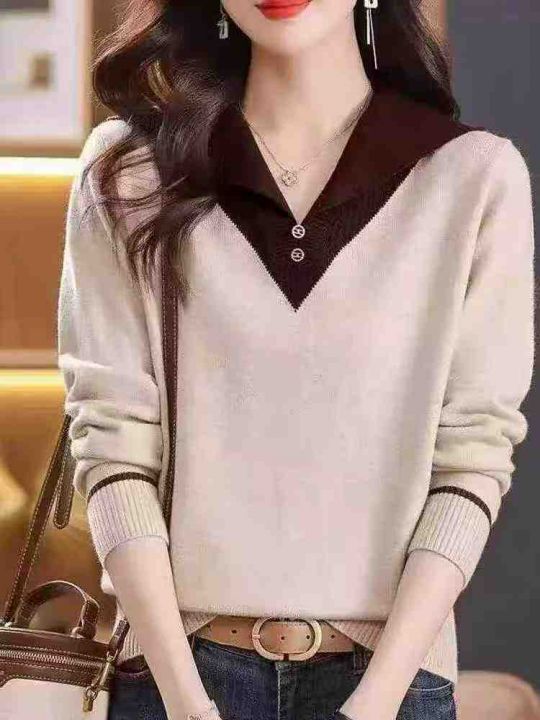 秋季新款高品质时尚百搭洋气减龄弹力显瘦翻领宽松外搭长袖包芯纱套头毛衣,...