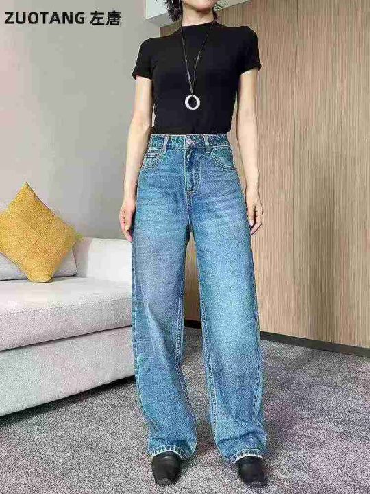 121条左唐高腰窄版阔腿牛仔裤女春秋宽松显瘦美式无弹力硬挺直筒长裤子,码...