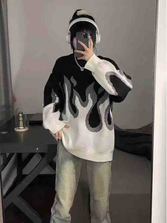 秋冬新款国潮牌原创撞色渐变火焰暗黑亚比风男女同款提花芝麻底圆领套头毛衣...