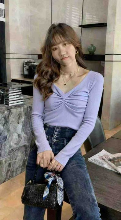 秋季新款弹力修身显瘦V领褶皱套头毛衣,独立包装,单款多色,均码面料柔软...