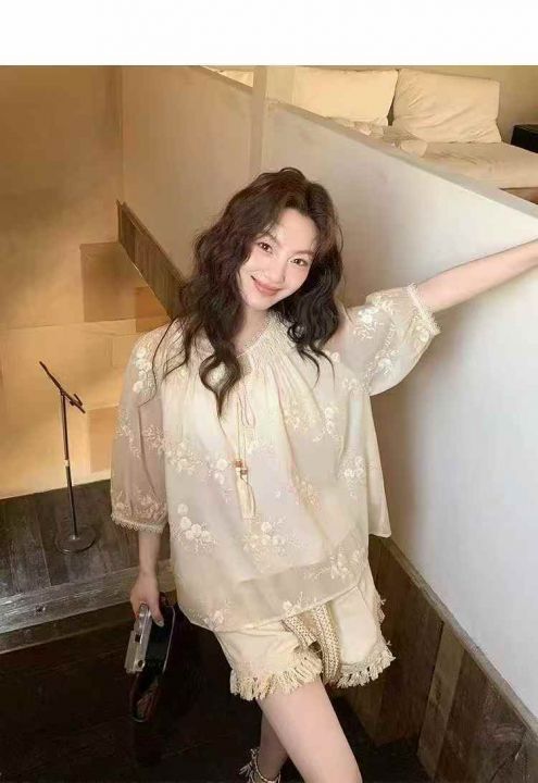 上新全清:9.9一件法式甜美小清新绣花拼接灯笼袖上衣,模特图仅供参考,[爱...