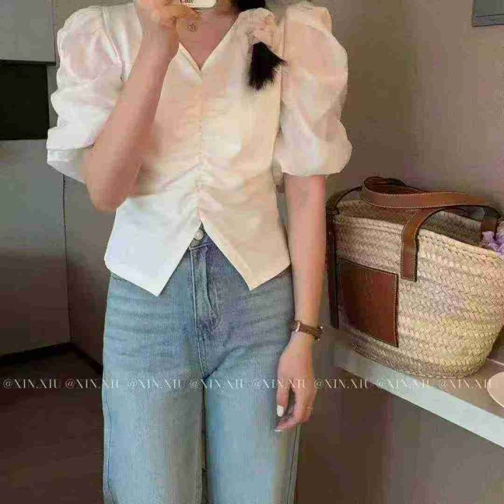 上新全清:10.8一件韩系V领设计感泡泡袖百搭上衣,[爱心]55件左右,杏色,...