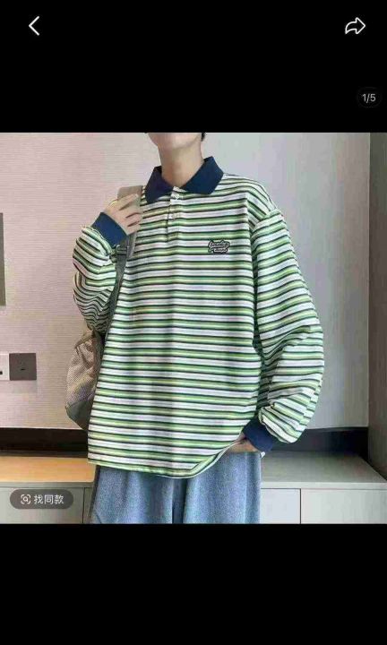 男装春秋季新款减龄POLO领条纹纽扣卫衣宽松休闲上衣,重工刺绣,单款2色,...